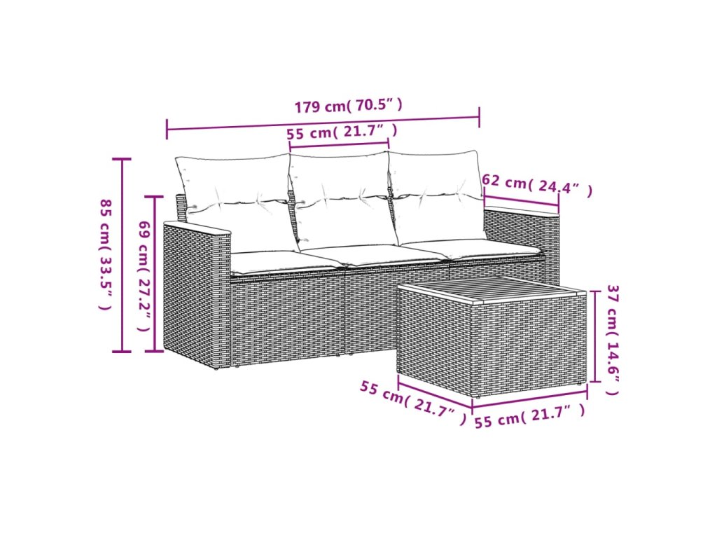 Tato zahradní sedací souprava je dokonalým doplňkem vaší zahrady, terasy nebo dvorku a poskytne vám pohodlné a příjemné místo, kde si můžete povídat s rodinou a přáteli nebo jen tak odpočívat a užívat si pobyt venku.