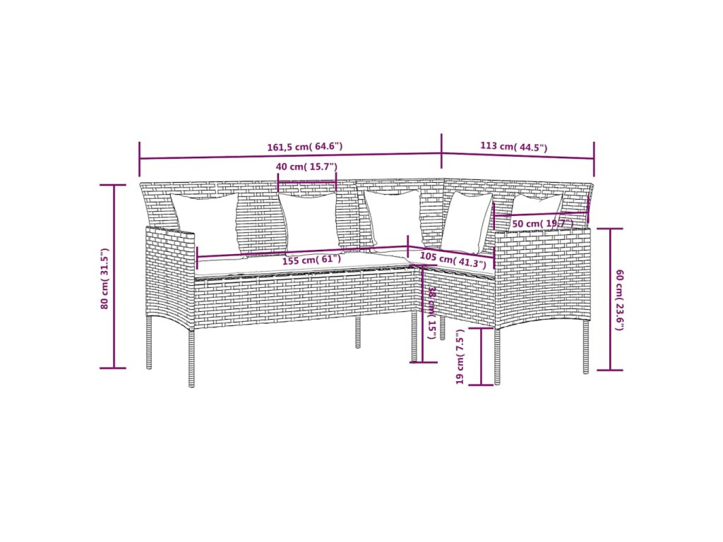 - Rozměry pohovky ve tvaru L: 161,5 x 113 x 80 cm (Š x H x V)