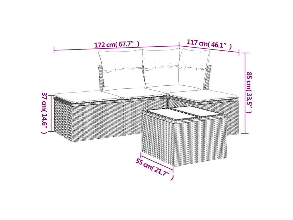 Tato zahradní sedací souprava je dokonalým doplňkem vaší zahrady, terasy nebo dvorku a poskytne vám pohodlné a příjemné místo, kde si můžete povídat s rodinou a přáteli nebo jen tak odpočívat a užívat si pobyt venku.