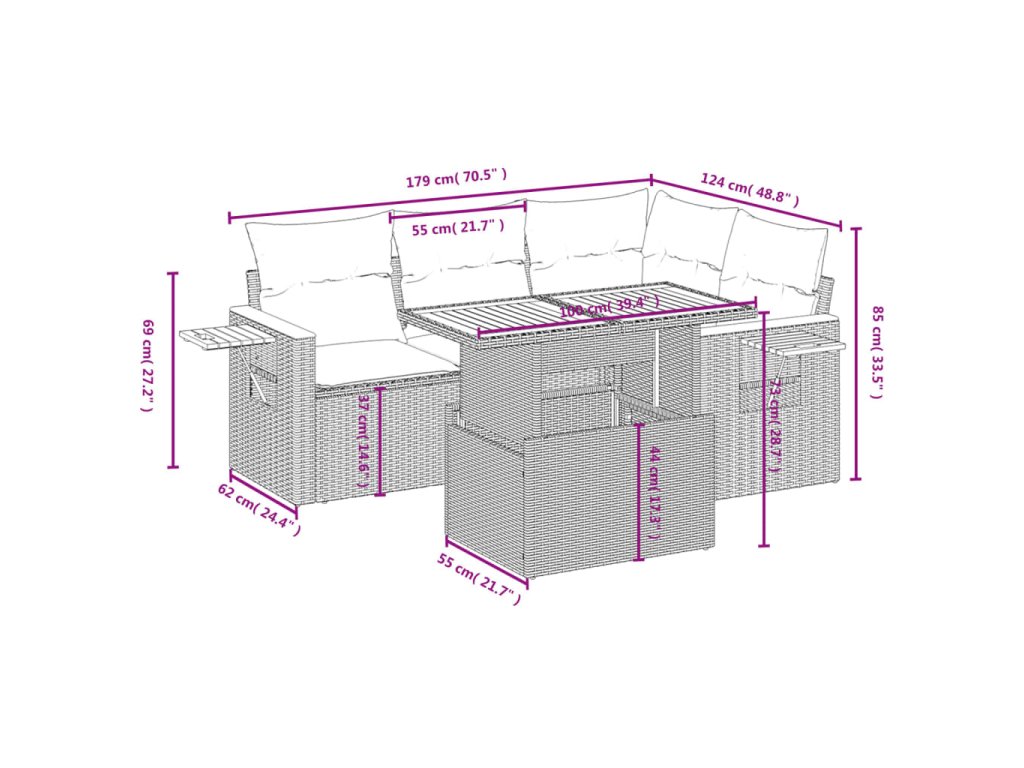 Tato zahradní sedací souprava je dokonalým doplňkem vaší zahrady, terasy nebo dvorku a poskytne vám pohodlné a příjemné místo, kde si můžete povídat s rodinou a přáteli nebo jen tak odpočívat a užívat si pobyt venku.