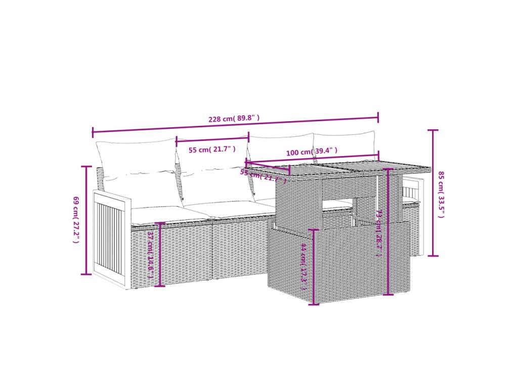 Tato zahradní sedací souprava je dokonalým doplňkem vaší zahrady, terasy nebo dvorku a poskytne vám pohodlné a příjemné místo, kde si můžete povídat s rodinou a přáteli nebo jen tak odpočívat a užívat si pobyt venku.