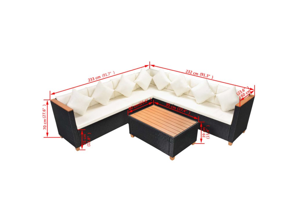 Dodávka zahrnuje dva 2místné pohovkové segmenty (každý s jednou područkou), jeden rohový segment pohovky, jeden 1místný segment pohovky bez područky, jeden konferenční stolek, osm polštářů, osm zádových polštářů a čtyři sedáky. Poznámka: Doporučujeme soupravu za deště, sněhu a mrazu přikrýt.