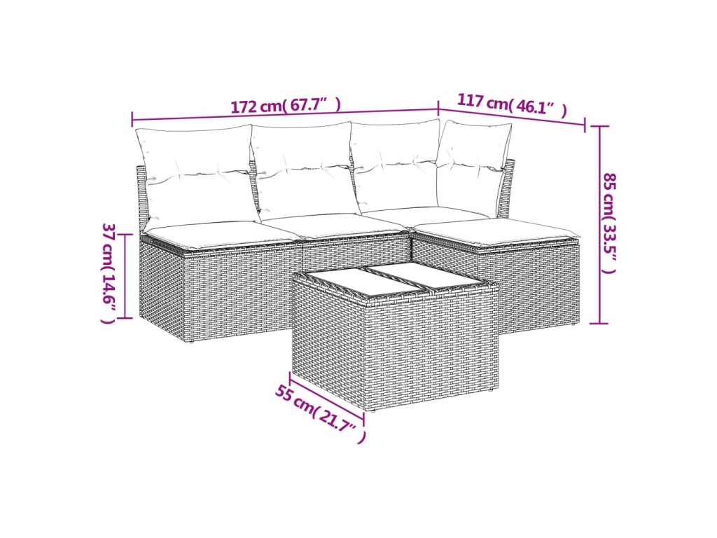 Tato zahradní sedací souprava je dokonalým doplňkem vaší zahrady, terasy nebo dvorku a poskytne vám pohodlné a příjemné místo, kde si můžete povídat s rodinou a přáteli nebo jen tak odpočívat a užívat si pobyt venku.