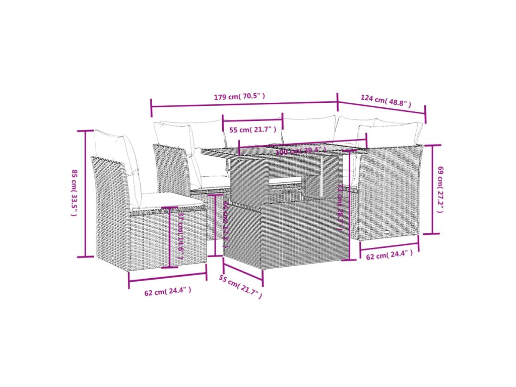 Tato zahradní sedací souprava je dokonalým doplňkem vaší zahrady, terasy nebo dvorku a poskytne vám pohodlné a příjemné místo, kde si můžete povídat s rodinou a přáteli nebo jen tak odpočívat a užívat si pobyt venku.