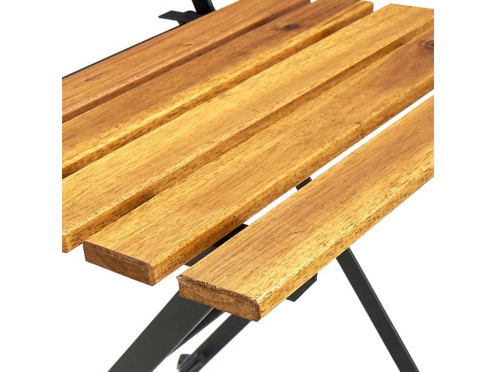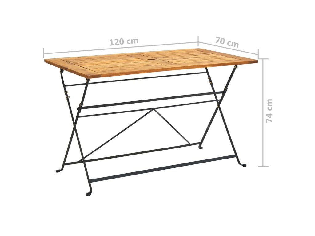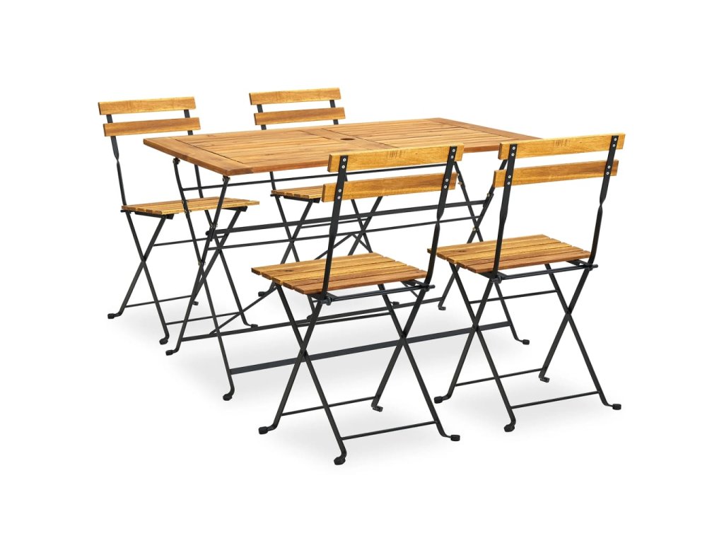 Tato zahradní jídelní set je vyrobený z masivního akáciového dřeva, tropického tvrdého dřeva, které je odolné vůči klimatickým vlivům a má dlouhou životnost. Robustní ocel zaručuje další stabilitu. Stůl a židle se snadno čistí vlhkým hadříkem, a když je právě nepoužíváte, můžete je sklopit a ušetřit místo. Kromě toho ve ve středu stolní desky otvor o průměru 5 cm pro umístění vašeho slunečníku.