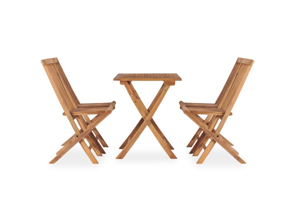 Nábytek je zhotovený z extrémně odolného teakového tvrdého dřeva, které již prošlo procesem smršťování, bylo uměle vysušené a poté jemně a dohladka obroušené. Toto dřevo je oceňované pro svou výjimečnou pevnost a klimatickou odolnost, a proto je zdaleka nejvhodnějším materiálem pro výrobu zahradního nábytku. Jedná se o skvělou volbu, pokud si chcete pořídit zahradní vybavení, které vám vydrží sloužit dlouhá léta. Když jídelní stůl a židle zrovna nepoužíváte, můžete ji složit a ušetřit tak místo.