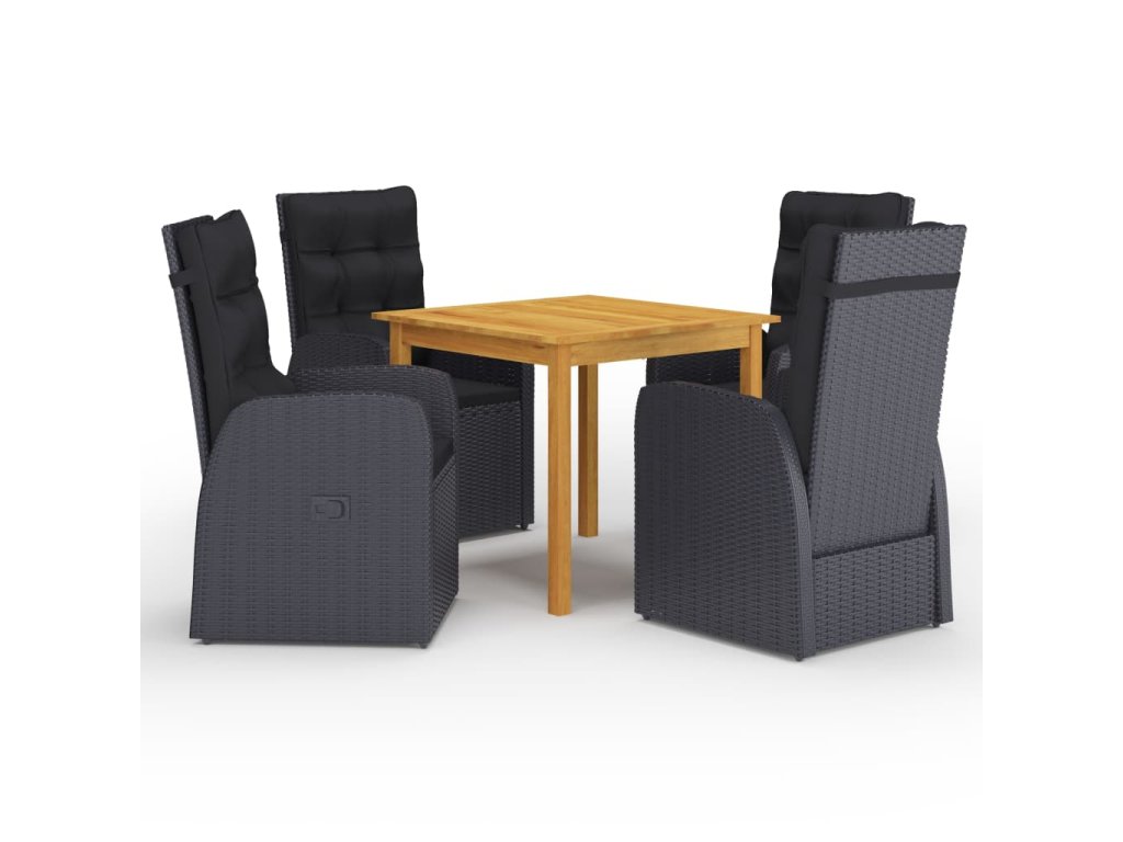 Jídelní stůl je zhotovený z masivního akáciového dřeva s olejovaným povrchem, takže je stabilní, odolný a nenáročný na údržbu. Jídelní židle mají rám z práškově lakované oceli, opletený PE ratanem, který výborně vzdoruje klimatickým vlivům. Dlouho vám proto vydrží a snadno je očistíte. Opěradlo lze sklopit zatažením za tlačítko na boku. Židle mají lehkou konstrukci, není tedy problém je přesunout, kam potřebujete. Navíc jsou opatřené mimořádně pohodlnými, hustě polstrovanými poduškami pro maximální komfort. Jejich polyesterové potahy nevyžadují téměř žádnou údržbu a dají se stáhnout a oprat.