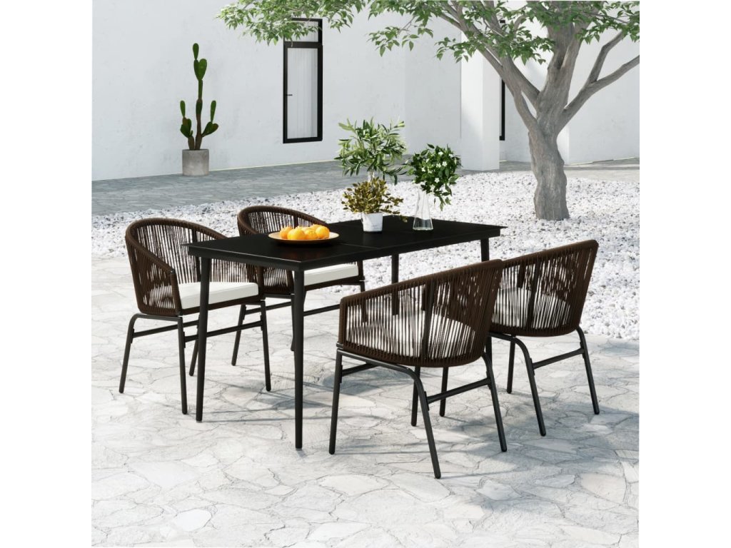 Zahradní jídelní set má práškově lakovaný ocelový rám, takže je robustní a stabilní a ideální pro venkovní použití. Hladká skleněná deska stolu se snadno čistí vlhkým hadříkem a skvěle vám poslouží k podávání jídla a pití nebo k vystavení různých dekorativních předmětů. Židle jsou vyrobené z PVC ratanu, jsou proto odolné a výborně vzdorují UV záření i špatnému počasí. Každá z nich je navíc opatřená odnímatelnou hustě polstrovanou poduškou, a zpříjemní vám tak váš odpočinek.