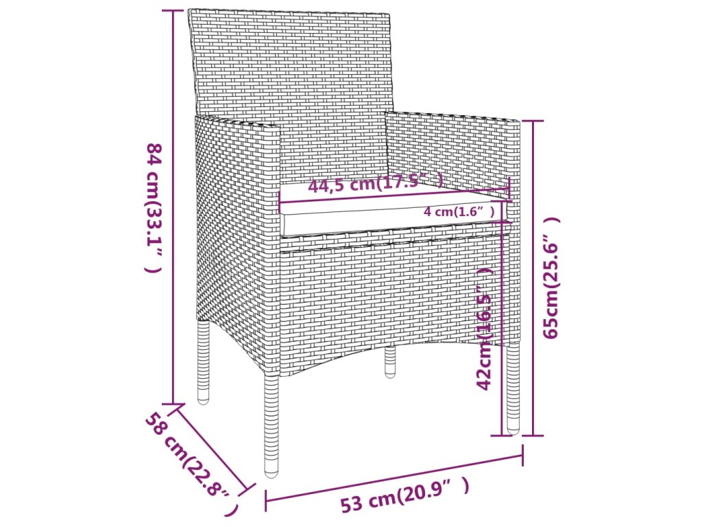 Zahradní jídelní set má práškově lakovaný ocelový rám opletený polyratanem, takže je velmi odolný. Stolní deska je zhotovena z tvrzeného skla, což usnadňuje její čištění. Hustě polstrované podušky vám navíc při sezení poskytnou maximální pohodlí.