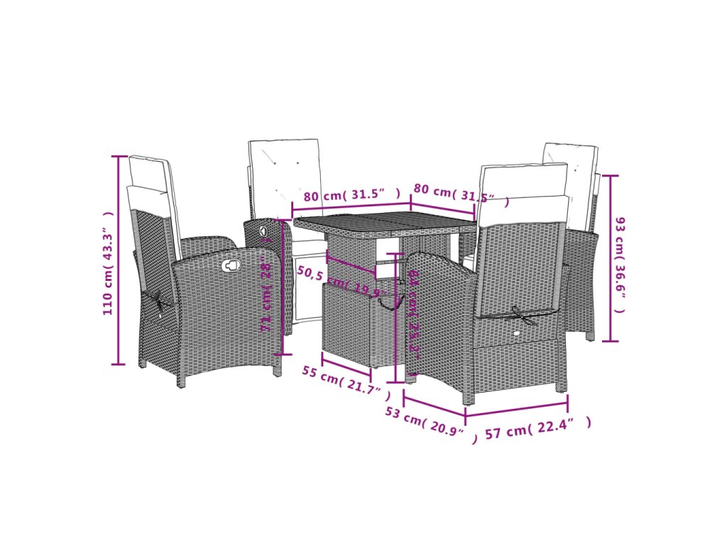 - Materiál: PE ratan, práškově lakovaná ocel, masivní akáciové dřevo s olejovou povrchovou úpravou