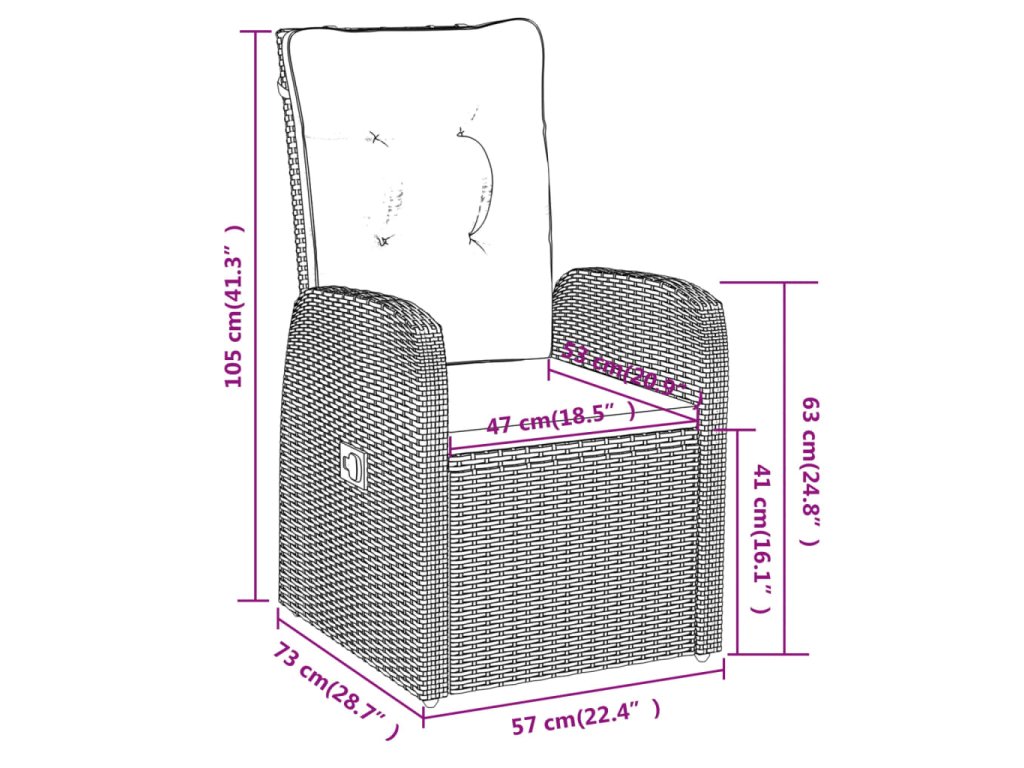 Stůl i židle mají rámy z práškově lakované oceli, jsou tedy robustní, stabilní a vhodné pro každodenní venkovní použití. Židle jsou vyrobené z voděodolného PE ratanu, takže se snadno čistí a hodně toho vydrží. Opěradlo si můžete nastavit stisknutím tlačítka na boku. Nábytek má lehkou konstrukci, lze ho tudíž bez námahy přesouvat. Husté polstrované podušky na sedák vám navíc zajistí mimořádné pohodlí. Jejich polyesterové potahy jsou nenáročné na údržbu a dají se stáhnout a vyprat. Hladká skleněná stolní deska, kterou jednoduše očistíte vlhkým hadříkem, je ideální k podávání jídla a pití nebo k vystavení různých dekorativních předmětů.