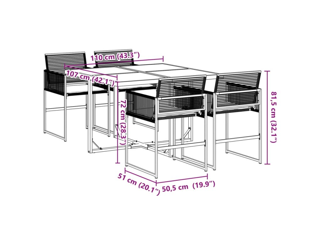 - Kompaktní skladování: Tyto zahradní židle lze úhledně schovat pod stůl a ušetřit tak místo.