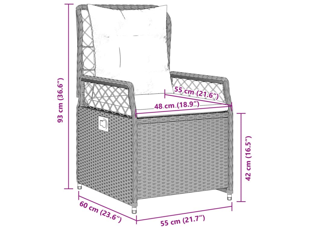 - Rozměry při poloze vsedě: 55 x 60 x 93 cm (Š x H x V)