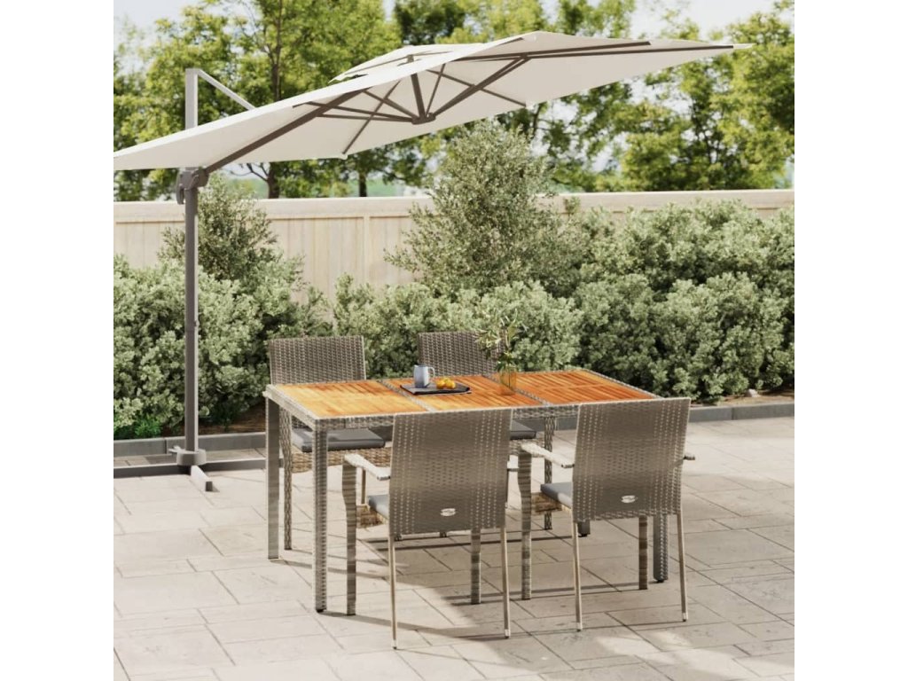 - Materiál: PE ratan, práškově lakovaná ocel, masivní akáciové dřevo s olejovou povrchovou úpravou