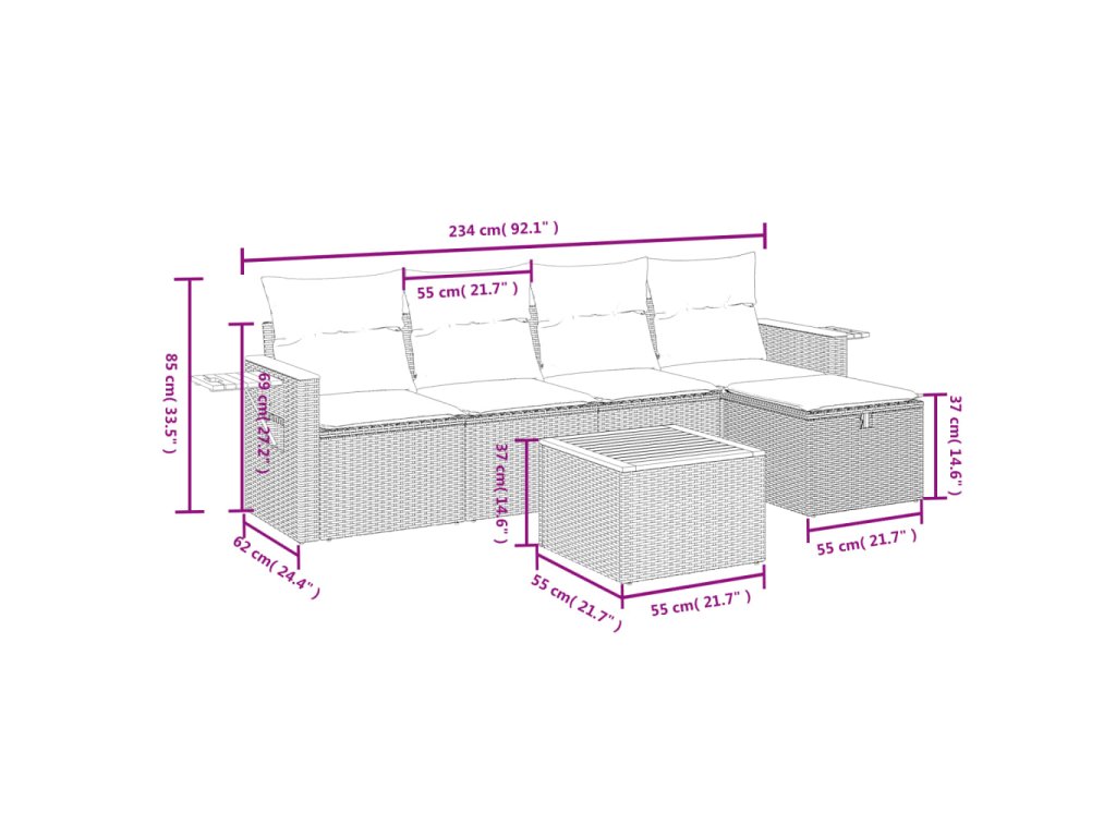 Tato zahradní sedací souprava je dokonalým doplňkem vaší zahrady, terasy nebo dvorku a poskytne vám pohodlné a příjemné místo, kde si můžete povídat s rodinou a přáteli nebo jen tak odpočívat a užívat si pobyt venku.