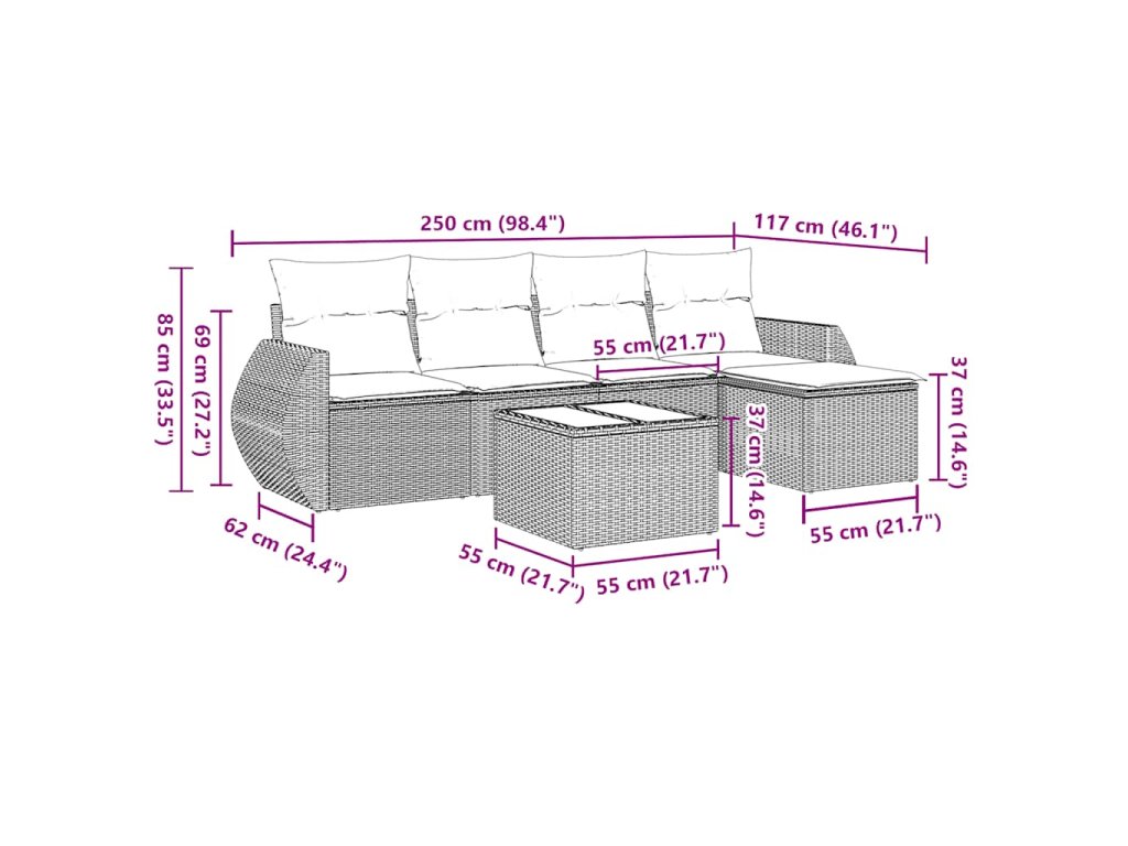Tato zahradní sedací souprava je dokonalým doplňkem vaší zahrady, terasy nebo dvorku a poskytne vám pohodlné a příjemné místo, kde si můžete povídat s rodinou a přáteli nebo jen tak odpočívat a užívat si pobyt venku.