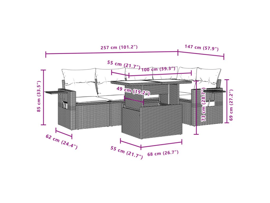 Tato zahradní sedací souprava je dokonalým doplňkem vaší zahrady, terasy nebo dvorku a poskytne vám pohodlné a příjemné místo, kde si můžete povídat s rodinou a přáteli nebo jen tak odpočívat a užívat si pobyt venku.