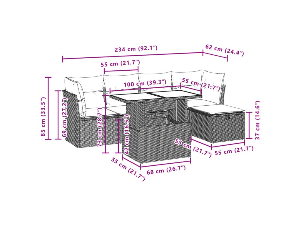 Tato zahradní sedací souprava je dokonalým doplňkem vaší zahrady, terasy nebo dvorku a poskytne vám pohodlné a příjemné místo, kde si můžete povídat s rodinou a přáteli nebo jen tak odpočívat a užívat si pobyt venku.