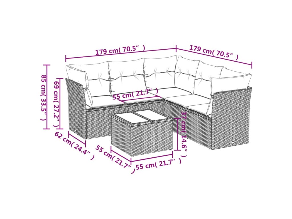 - Celkové rozměry pohovky: 179 x 179 x 69 cm (Š x H x V)