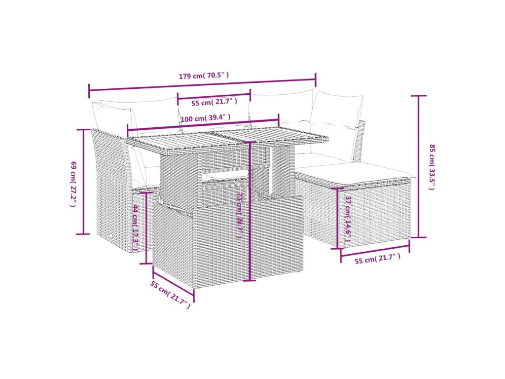 Tato zahradní sedací souprava je dokonalým doplňkem vaší zahrady, terasy nebo dvorku a poskytne vám pohodlné a příjemné místo, kde si můžete povídat s rodinou a přáteli nebo jen tak odpočívat a užívat si pobyt venku.