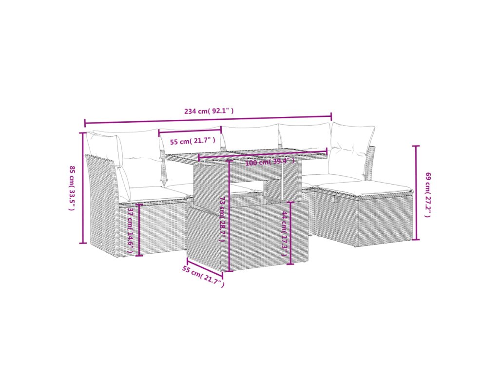 Tato zahradní sedací souprava je dokonalým doplňkem vaší zahrady, terasy nebo dvorku a poskytne vám pohodlné a příjemné místo, kde si můžete povídat s rodinou a přáteli nebo jen tak odpočívat a užívat si pobyt venku.
