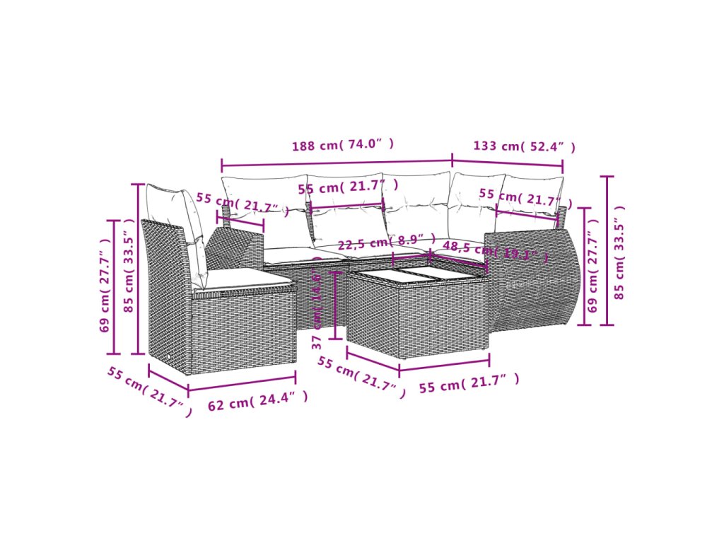Tato zahradní sedací souprava je dokonalým doplňkem vaší zahrady, terasy nebo dvorku a poskytne vám pohodlné a příjemné místo, kde si můžete povídat s rodinou a přáteli nebo jen tak odpočívat a užívat si pobyt venku.