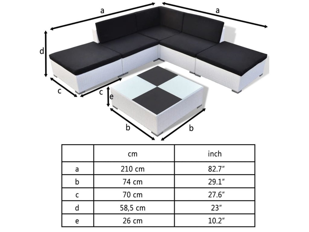 Dodávka obsahuje 1 x rohové sedadlo, 2 x sedadlo bez područek, 2 x stolička, 1 x konferenční stolek se skleněnou deskou, 5 x polstr na sedák a 4 x polstr na opěradlo.