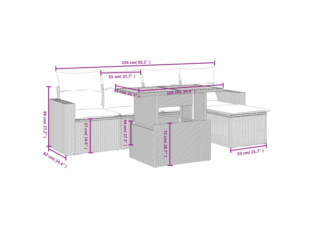 Tato zahradní sedací souprava je dokonalým doplňkem vaší zahrady, terasy nebo dvorku a poskytne vám pohodlné a příjemné místo, kde si můžete povídat s rodinou a přáteli nebo jen tak odpočívat a užívat si pobyt venku.