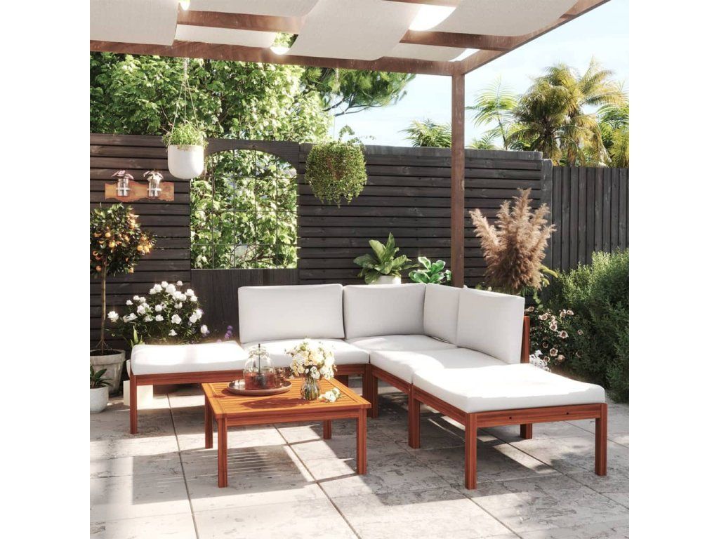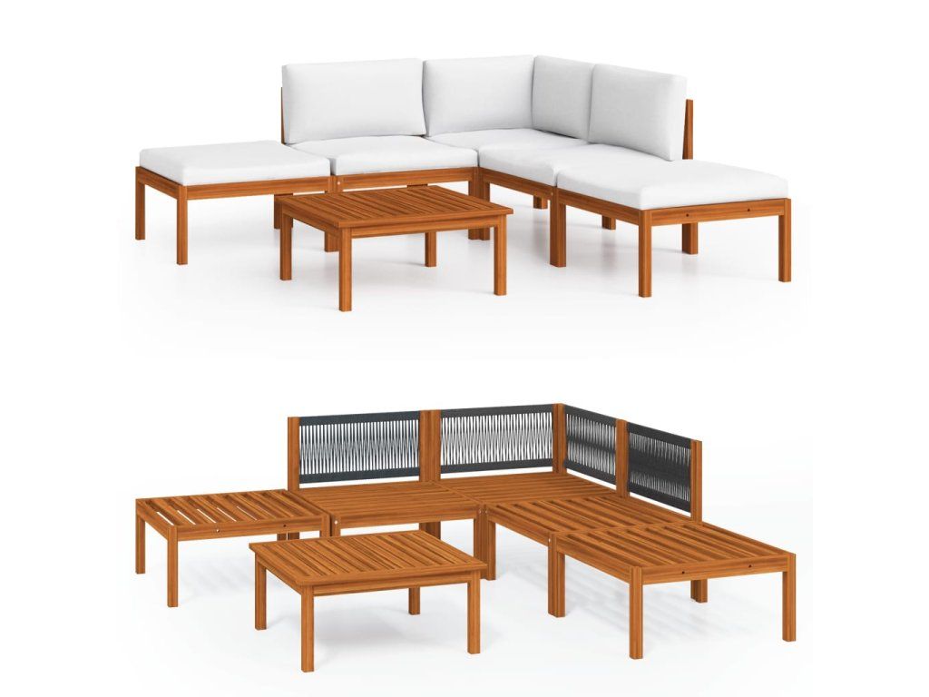 - Masivní akáciové dřevo: Masivní akáciové dřevo je krásný přírodní materiál. Akáciové dřevo je tropické tvrdé dřevo, které je husté, robustní a odolné. Rám sedací soupravy vyrobený z olejovaného akáciového dřeva je proto stabilní a snadno se udržuje.
