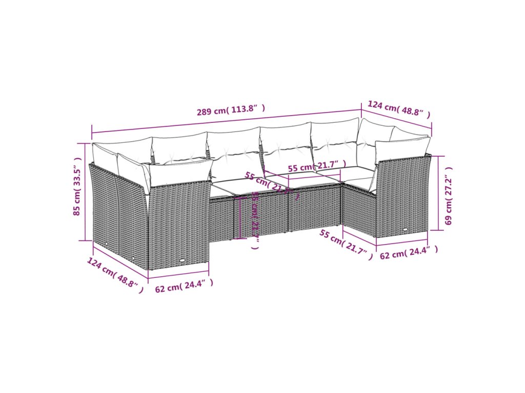 - Celkové rozměry pohovky: 289 x 124 x 69 cm (Š x H x V)