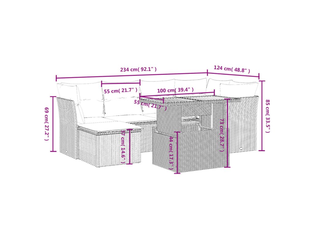 Tato zahradní sedací souprava je dokonalým doplňkem vaší zahrady, terasy nebo dvorku a poskytne vám pohodlné a příjemné místo, kde si můžete povídat s rodinou a přáteli nebo jen tak odpočívat a užívat si pobyt venku.