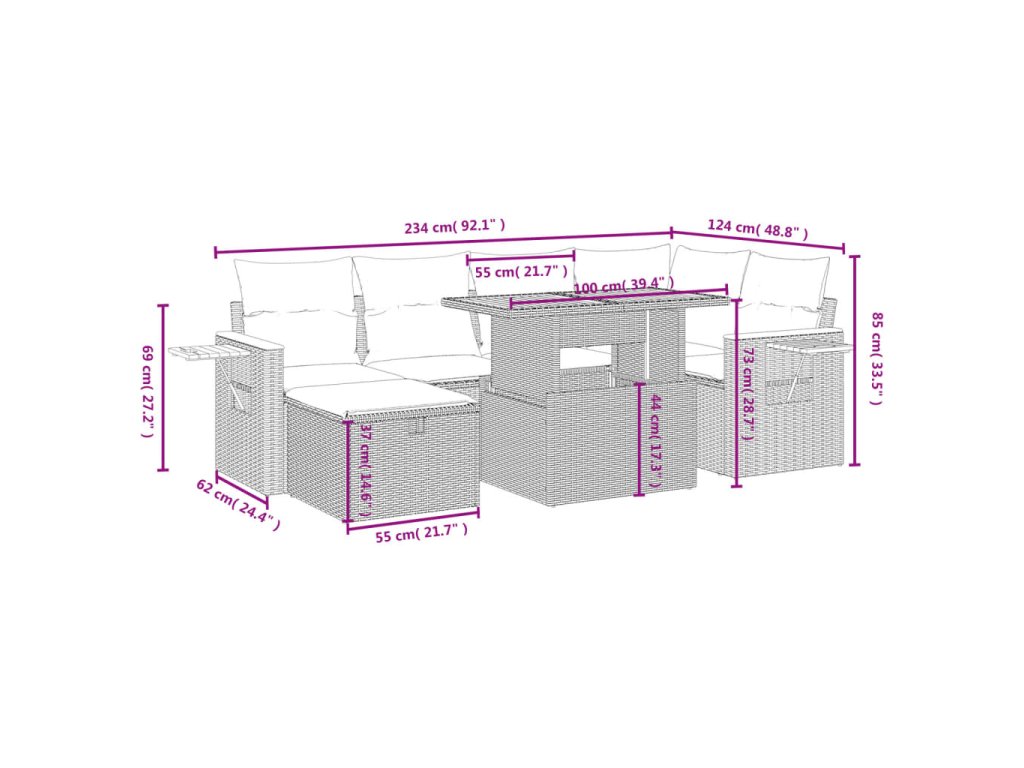 Tato zahradní sedací souprava je dokonalým doplňkem vaší zahrady, terasy nebo dvorku a poskytne vám pohodlné a příjemné místo, kde si můžete povídat s rodinou a přáteli nebo jen tak odpočívat a užívat si pobyt venku.