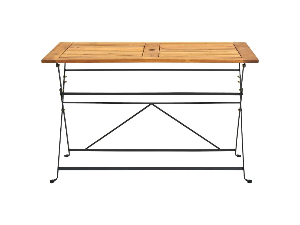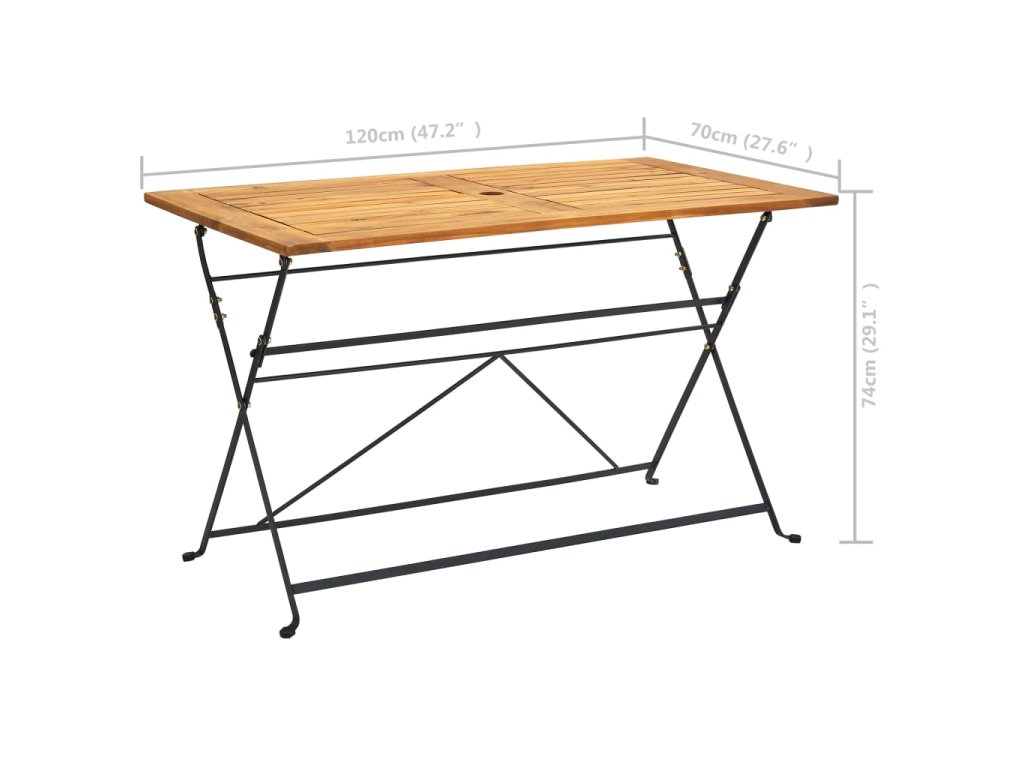 Tato zahradní jídelní set je vyrobený z masivního akáciového dřeva, tropického tvrdého dřeva, které je odolné vůči klimatickým vlivům a má dlouhou životnost. Robustní ocel zaručuje další stabilitu. Stůl a židle se snadno čistí vlhkým hadříkem, a když je právě nepoužíváte, můžete je sklopit a ušetřit místo. Kromě toho ve ve středu stolní desky otvor o průměru 5 cm pro umístění vašeho slunečníku.