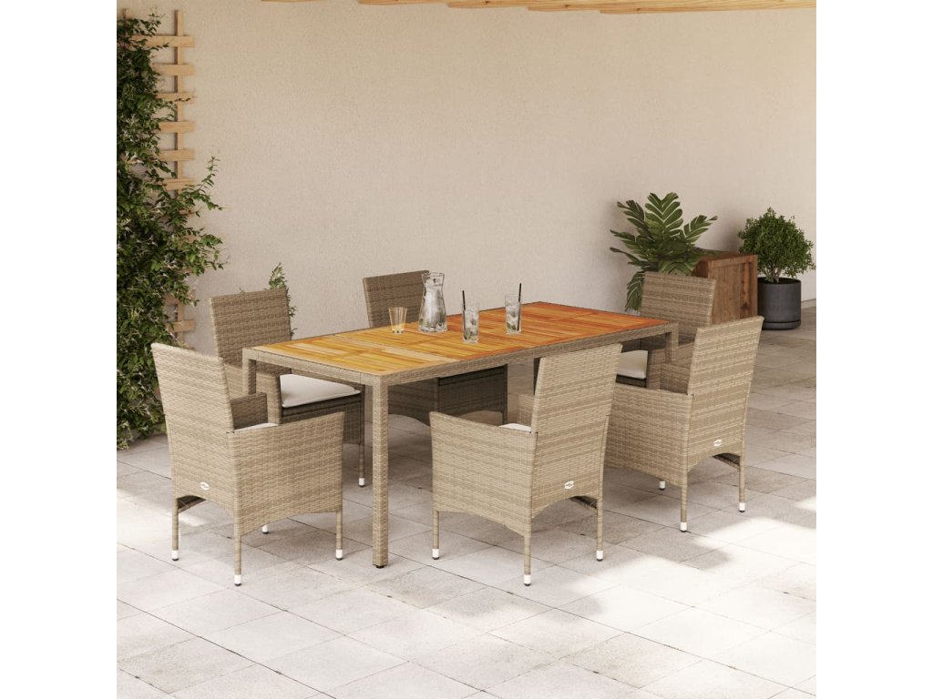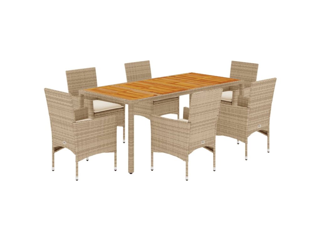 7dílný zahradní jídelní set a podušky béžový polyratan a akácie 3278685