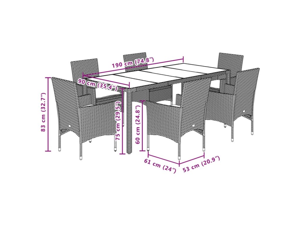 - Materiál: PE ratan, práškově lakovaná ocel, masivní akáciové dřevo s olejovou povrchovou úpravou