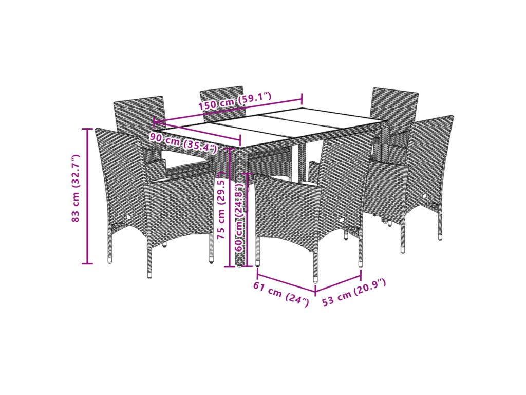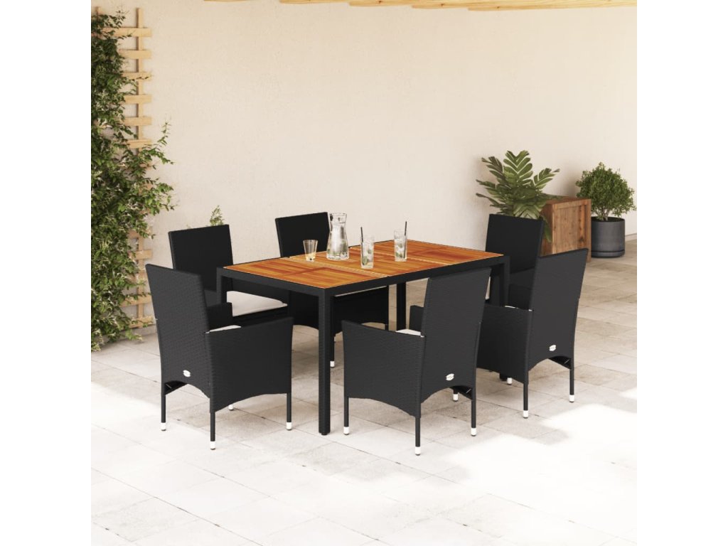 7dílný zahradní jídelní set a podušky černý polyratan a akácie 3278666