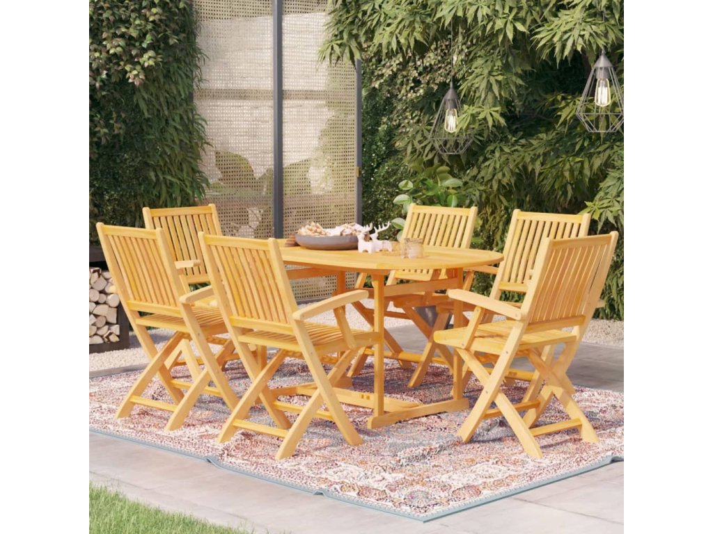 Nábytková sestava má překrásnou povrchovou úpravu, která dřevu dodává hřejivý odstín. Ve stolu se nachází otvor na slunečník, abyste se mohli chránit před sluncem. Zaoblené sedáky a opěradla židlí ideálně kopírují tvar vašeho těla. Židle mají navíc skládací design, aby vám zbytečně nepřekážely, když je zrovna nepoužíváte. Lehká konstrukce usnadňuje jejich přesouvání. Celá sada nábytku vám poskytne maximální pohodlí a zpříjemní vám čas strávený s vaší rodinou a přáteli. K očištění vám přitom postačí navlhčený hadřík.