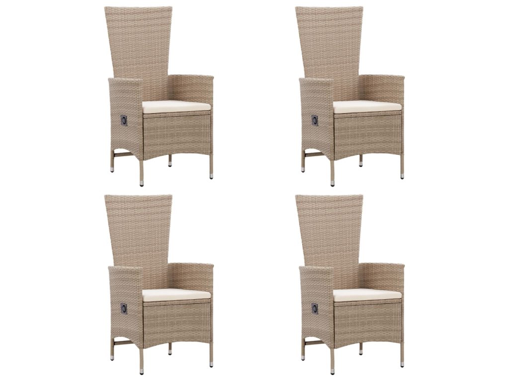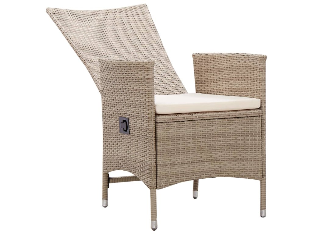 Jídelní stůl je zhotovený z masivního akáciového dřeva, takže je pevný a stabilní. Olejem napuštěný povrch vám umožní používat tento stůl i ve venkovních prostorech. Jídelní židle mají ocelový rám, který je opletený klimaticky odolným PE ratanem, jsou proto bytelné a snadno se udržují čisté. Područky jsou krásně zdůrazněné masivním akáciovým dřevem, které do vašeho domova vnese rustikální šarm. Stisknutím tlačítka na boku můžete sklopit opěradlo a zároveň i zvednout podnožku. Každá židle má hustě polstrovanou podušku, abyste si při odpočinku mohli dopřát mimořádný komfort.