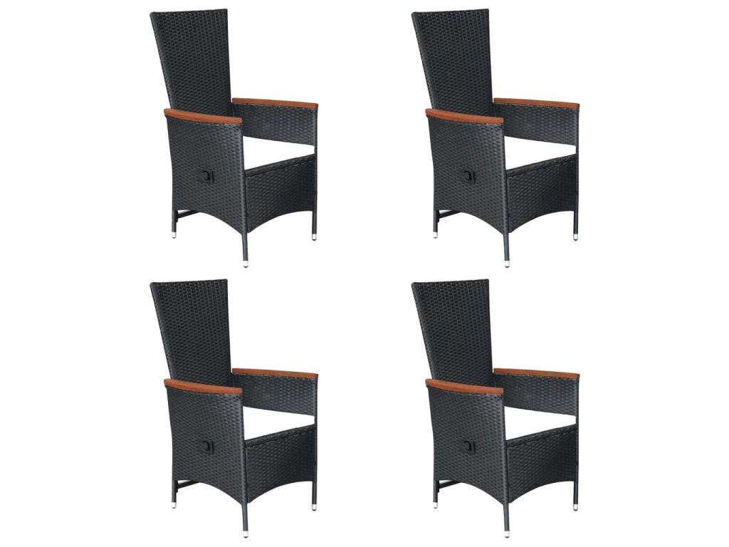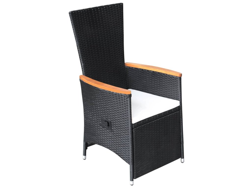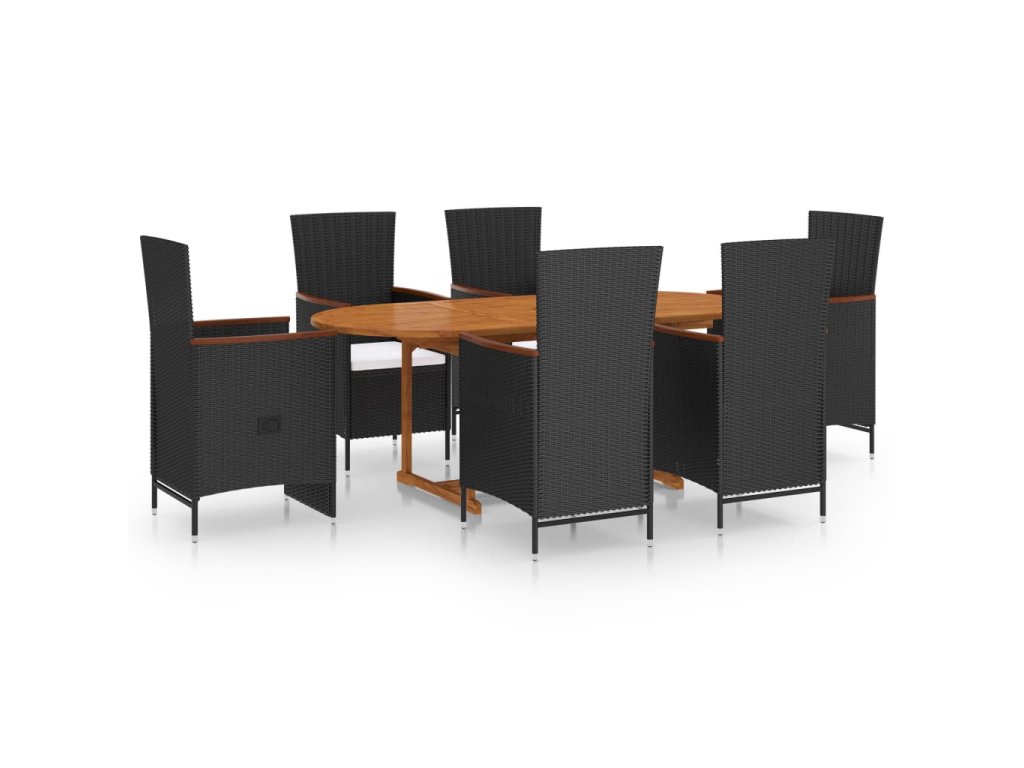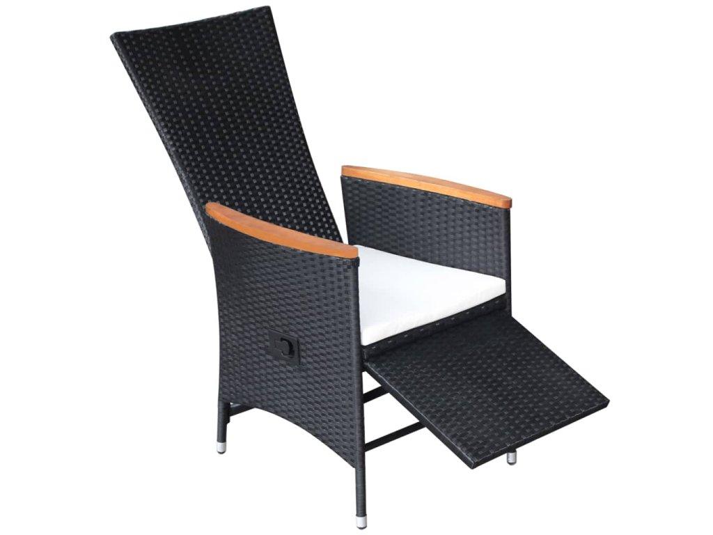 Jídelní stůl je zhotovený z masivního akáciového dřeva, takže je pevný a stabilní. Olejem napuštěný povrch vám umožní používat tento stůl i ve venkovních prostorech. Jídelní židle mají ocelový rám, který je opletený klimaticky odolným PE ratanem, jsou proto bytelné a snadno se udržují čisté. Područky jsou krásně zdůrazněné masivním akáciovým dřevem, které do vašeho domova vnese rustikální šarm. Stisknutím tlačítka na boku můžete sklopit opěradlo a zároveň i zvednout podnožku. Každá židle má hustě polstrovanou podušku, abyste si při odpočinku mohli dopřát mimořádný komfort.