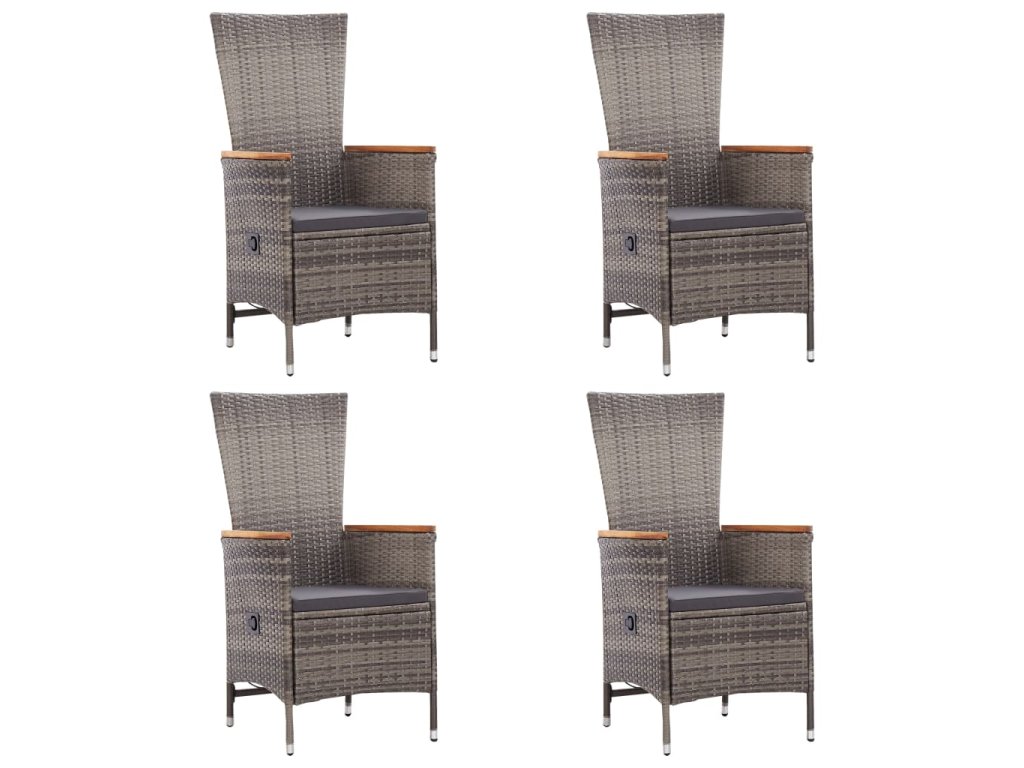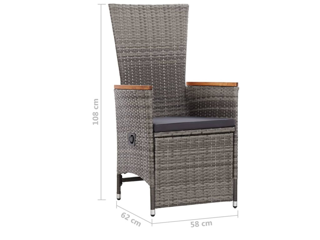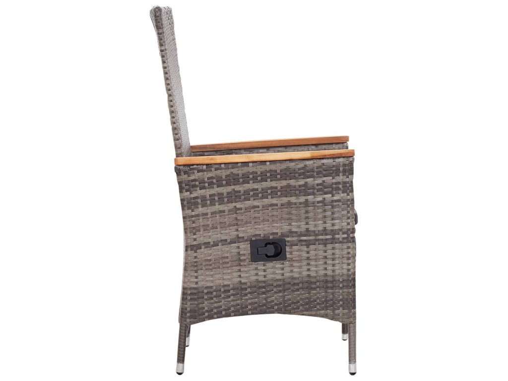 Jídelní stůl je zhotovený z masivního akáciového dřeva, takže je pevný a stabilní. Olejem napuštěný povrch vám umožní používat tento stůl i ve venkovních prostorech. Jídelní židle mají ocelový rám, který je opletený klimaticky odolným PE ratanem, jsou proto bytelné a snadno se udržují čisté. Područky jsou krásně zdůrazněné masivním akáciovým dřevem, které do vašeho domova vnese rustikální šarm. Stisknutím tlačítka na boku můžete sklopit opěradlo a zároveň i zvednout podnožku. Každá židle má hustě polstrovanou podušku, abyste si při odpočinku mohli dopřát mimořádný komfort.