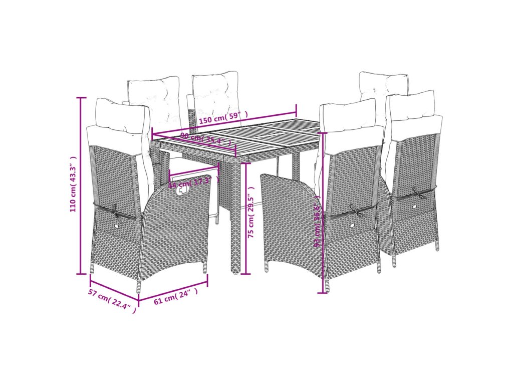 - Materiál: PE ratan, práškově lakovaná ocel, masivní akáciové dřevo s olejovou povrchovou úpravou