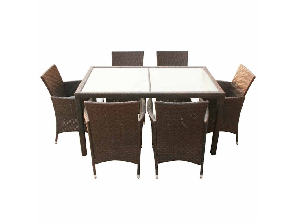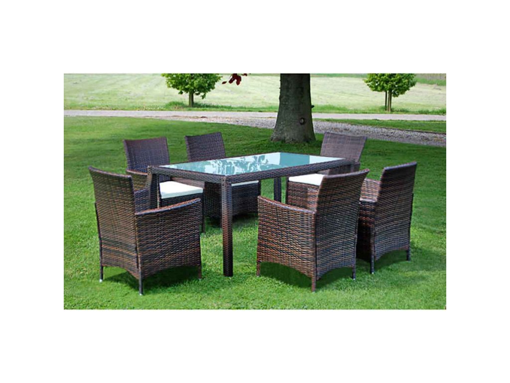 - Balení obsahuje 1 stůl se skleněnou deskou, 6 ratanových židlí a 6 odnímatelných polstrů na sedáky