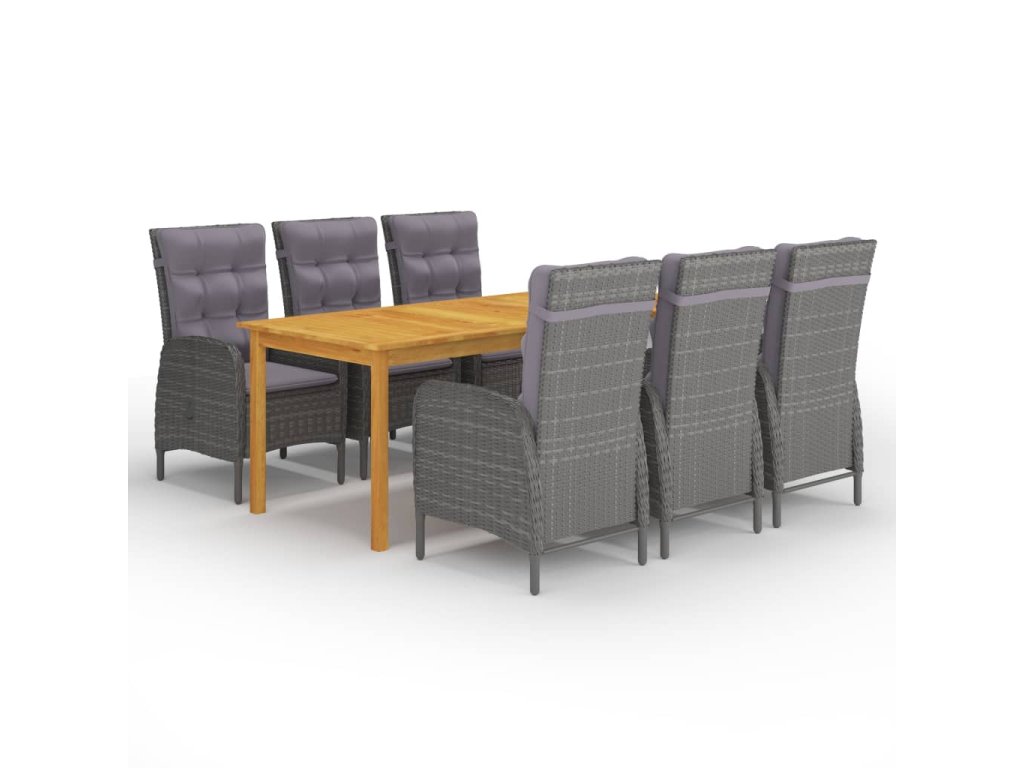 Jídelní stůl je zhotovený z masivního akáciového dřeva s olejovaným povrchem, takže je stabilní, odolný a nenáročný na údržbu. Jídelní židle mají rám z práškově lakované oceli, opletený PE ratanem, který výborně vzdoruje klimatickým vlivům. Dlouho vám proto vydrží a snadno je očistíte. Zahradní židle mají zaoblená opěradla a područky, které přispívají k většímu pohodlí, stejně jako jejich ergonomický tvar. Židle dodáváme s poduškami, které mají pratelné odnímatelné potahy na zip a zaručí vám při sezení maximální komfort.