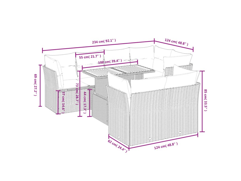 Tato zahradní sedací souprava je dokonalým doplňkem vaší zahrady, terasy nebo dvorku a poskytne vám pohodlné a příjemné místo, kde si můžete povídat s rodinou a přáteli nebo jen tak odpočívat a užívat si pobyt venku.