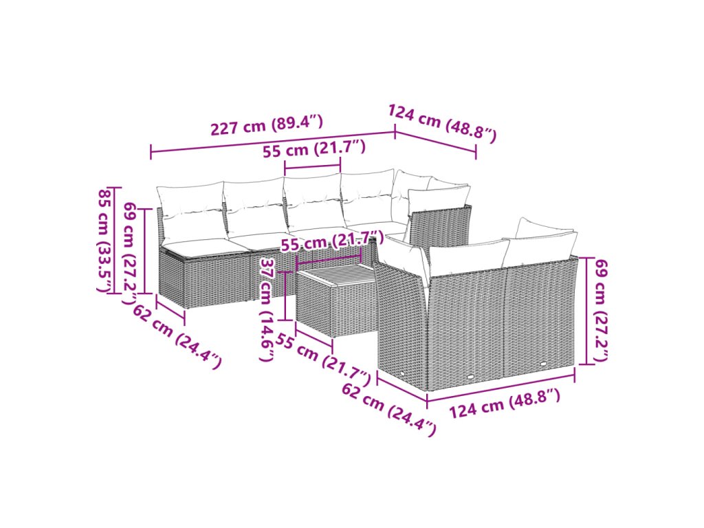 Tato zahradní sedací souprava je dokonalým doplňkem vaší zahrady, terasy nebo dvorku a poskytne vám pohodlné a příjemné místo, kde si můžete povídat s rodinou a přáteli nebo jen tak odpočívat a užívat si pobyt venku.