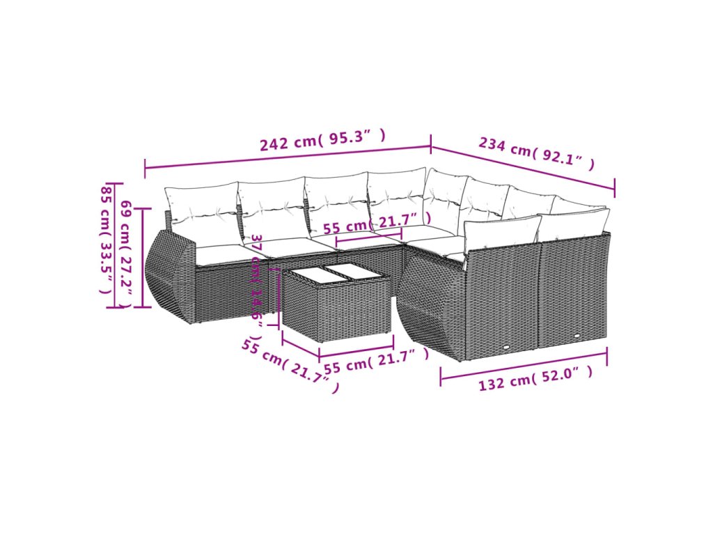Tato zahradní sedací souprava je dokonalým doplňkem vaší zahrady, terasy nebo dvorku a poskytne vám pohodlné a příjemné místo, kde si můžete povídat s rodinou a přáteli nebo jen tak odpočívat a užívat si pobyt venku.