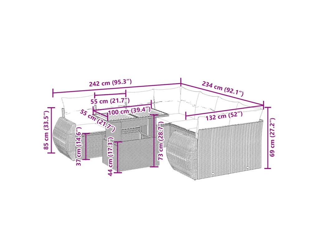 Tato zahradní sedací souprava je dokonalým doplňkem vaší zahrady, terasy nebo dvorku a poskytne vám pohodlné a příjemné místo, kde si můžete povídat s rodinou a přáteli nebo jen tak odpočívat a užívat si pobyt venku.