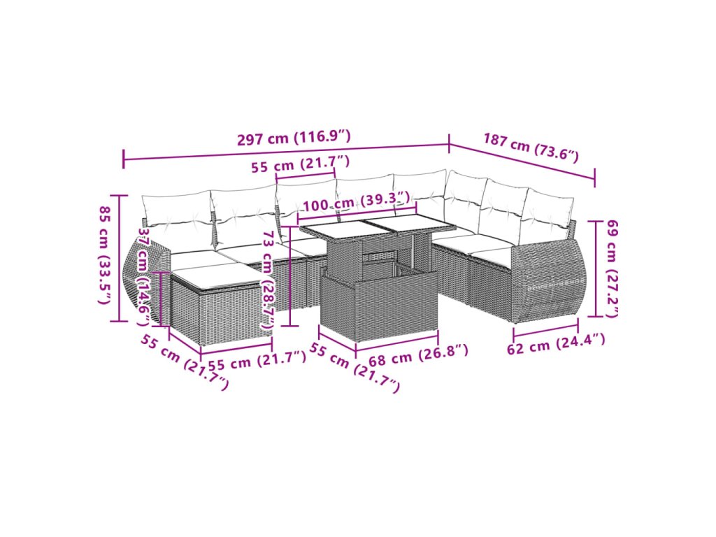 - Modulární design: Tato sada venkovního nábytku se vyznačuje modulární konstrukcí, je tedy zcela flexibilní a lze ji snadno přemisťovat, takže si můžete uspořádat venkovní nábytek dle vašich potřeb.
