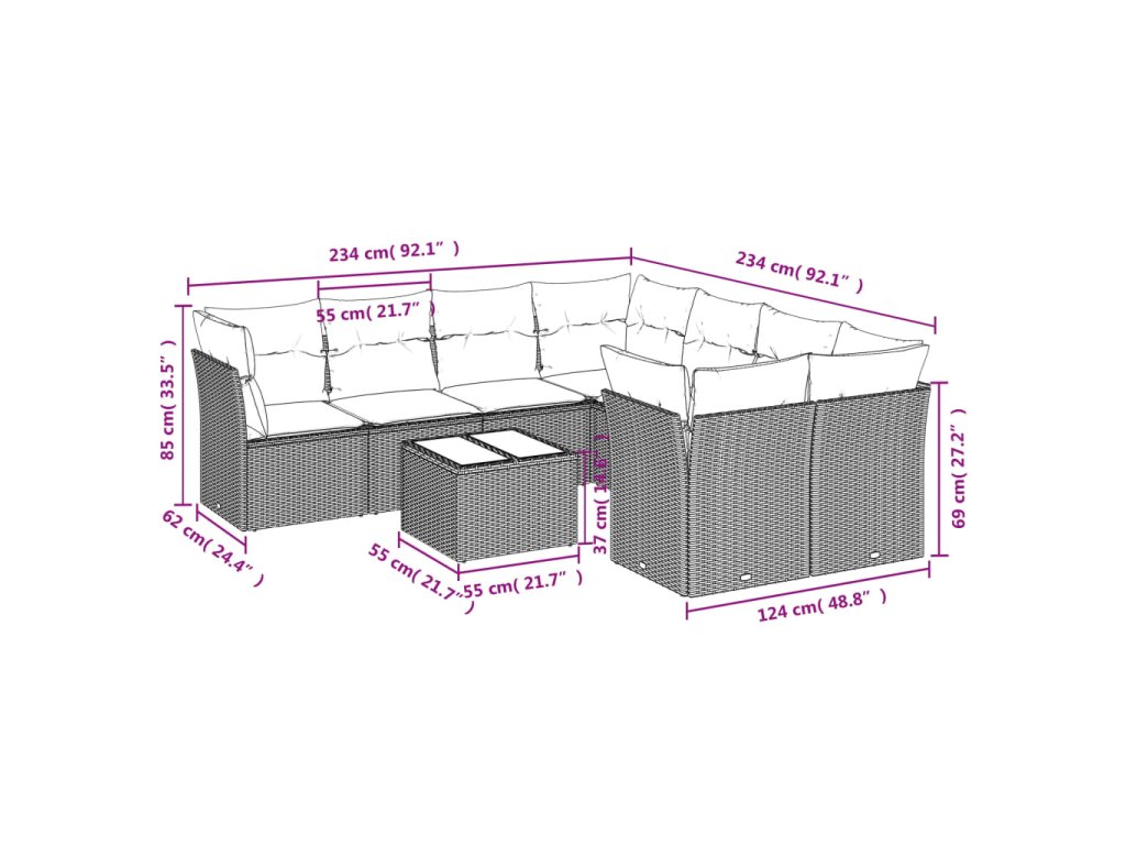 - Celkové rozměry pohovky: 234 x 234 x 69 cm (Š x H x V)