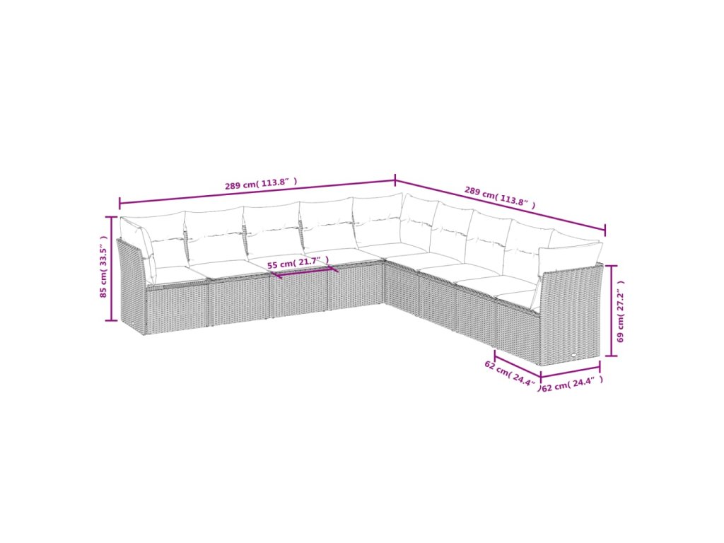 - Celkové rozměry pohovky: 289 x 289 x 69 cm (Š x H x V)